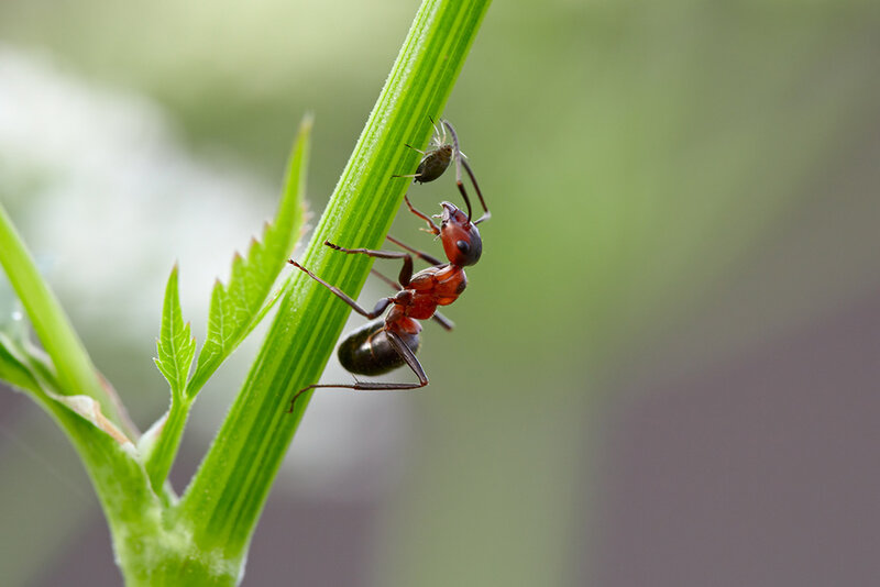 - Ameisen pflegen und schützen Blattlauskolonien auf den Pflanzen, um die süßen Ausscheidungen der Blattläuse zu erhalten. Wie ein guter Hirte schützen die Ameisen die Blattläuse vor Fressfeinden – sie vertreiben die Nützlinge oder beißen sie sogar tot. Ist die Wirtspflanze bereits stark ausgesogen, tragen die Ameisen die Läuse sogar auf andere Triebe oder Pflanzen und leisten so einen erheblichen Beitrag zur Blattlausverbreitung. Als „Dankeschön“ dürfen die Ameisen die Blattläuse melken. Sie streichen den Läusen über den Hinterleib. Das regt die Blattläuse zu verstärktem Saugen von Pflanzensaft an. Da die Läuse nicht den gesamten Zucker aus dem Pflanzensaft selbst verwerten, scheiden sie den Überschuss als süße Tropfen aus. Die Ameisen lecken diesen begierig auf. Einige Ameisenarten ernähren sich fast ausschließlich auf diese Weise.