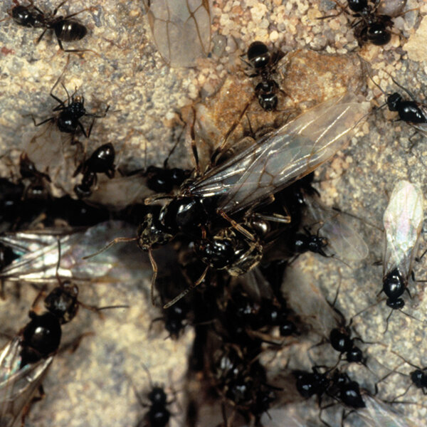 An manchen Stellen in der Umgebung des Menschen können Ameisen jedoch auch schädlich werden, so dass eine Bekämpfung notwendig wird. Mehr dazu finden Sie hier und hier. Ameisen zählen zu den „eusozialen“ (staatenbildenden) Insekten, wie z.B. auch Bienen und Wespen. Das Ameisenvolk besteht aus einer oder mehreren Königinnen und ungeflügelten Arbeiterinnen, die für die Versorgung der Nachkommen zuständig sind, sowie der Brut. In einem Staat können bis zu 20 Mio. Tiere leben. Zu bestimmten Zeiten im Jahr treten auch geflügelte Ameisenmännchen und -weibchen auf.