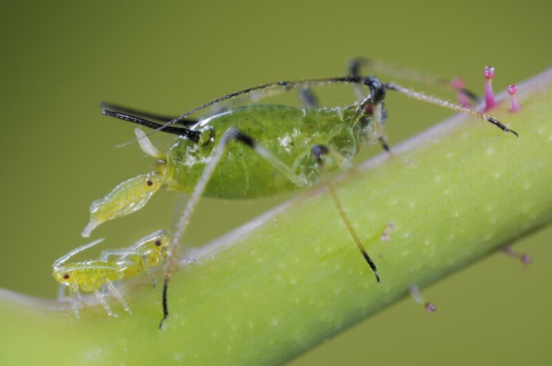 Wenn alle Blattläuse an der gleichen Pflanze bleiben würden, ginge diese schnell zugrunde. Dann hätten die Blattläuse keine Futterquelle mehr. Daher gibt es eine faszinierende Entwicklung: Bei zu vielen Blattläusen an der gleichen Pflanze werden auf einmal Läuse mit Flügeln geboren. Von den gleichen Läusen, die zuvor Blattläuse ohne Flügel zur Welt brachten. Die geflügelten Blattläuse fliegen, beziehungsweise lassen sich vom Wind tragen, und gelangen auf neue Pflanzen. Hier kommt die nächste Generation wieder ohne Flügel zur Welt.