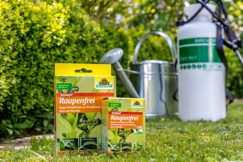Raupenfrei XenTari*,°° ist ein reines Fraßgift. Das heißt, die Raupen müssen es mit dem Fraß an den Blättern aufnehmen. Daher müssen Sie das Mittel sehr gründlich aussprühen, alle Blätter müssen benetzt, die Pflanzen tropfnass sein!