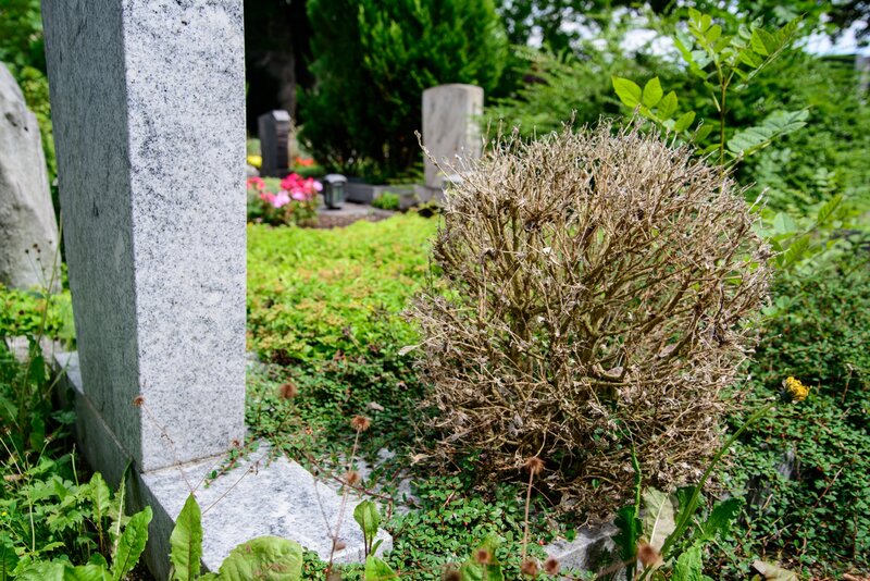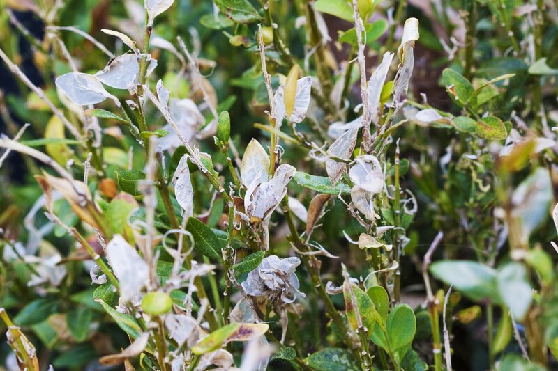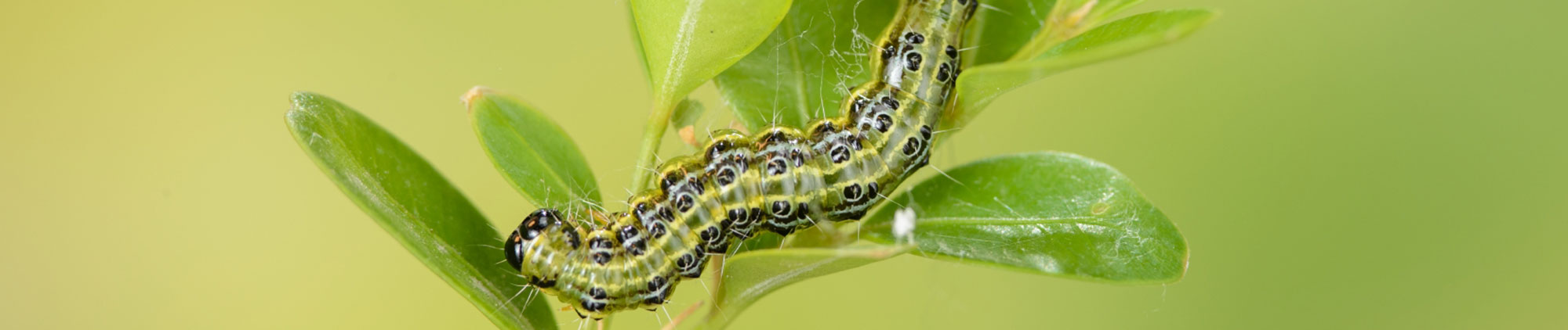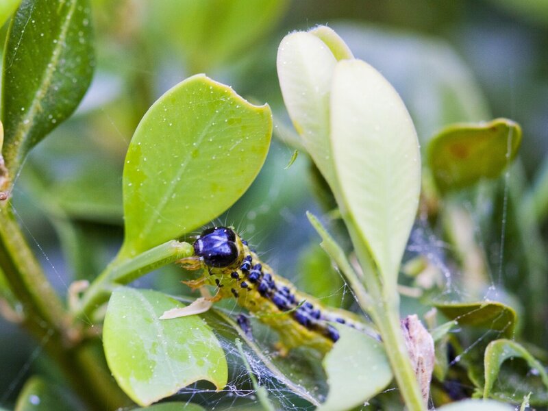 Es ist schwierig mit dem Erkennen! Die Raupen des Buchsbaumzünslers sind so gut getarnt, dass ihr Befall oft erst spät auffällt. Dabei kommt der Schädling, der aus Ostasien stammt und zunächst nur in Süddeutschland auftrat, mittlerweile in ganz Deutschland vor. Die gefräßigen Raupen sind grün mit dunklen Punkten und werden bis zu 5 cm lang. Noch mühsamer wird das Erkennen des Befalls dadurch, dass die Raupen erst versteckt im Inneren der Sträucher fressen. Während im Inneren des Buchsbaums schon der Kahlfraß beginnt, kann außen alles schön grün und gesund aussehen. Gut erkennbar sind die Gespinste, in denen vor allem die jungen Raupen leben. Bei starkem Befall sind auch die hellbraunen Kotkrümel sichtbar, die unter dem Buchsbaum liegen.