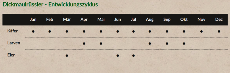 Die ca. 1 cm großen, grauschwarzen Rüsselkäfer fressen an den Blatträndern und hinterlassen U-förmige Buchten an überwiegend hartlaubigen Pflanzen, wie z. B. Rhododendron oder Kirschlorbeer. Dickmaulrüssler sind nachtaktiv und deshalb tagsüber schwer zu entdecken. Sie können nicht fliegen und können zwei Jahre alt werden. Die ca. 0,5 bis 1 cm großen, weißgefärbten Larven der Käfer leben im Boden und fressen an den Wurzeln der Pflanzen. Sie können dadurch die Pflanze nicht mehr mit Wasser und Nährstoffen versorgen. Die Pflanze wird braun und stirbt schließlich ab. Die Überwinterung erfolgt als Käfer und Larve im Boden. Pro Jahr treten zwei Generationen der Pflanzenschädlinge auf (siehe Tabelle unten). Die weiblichen Käfer legen bis zu 800 Eier pro Jahr, auch ohne vorhergehende Befruchtung. Sie bevorzugen dabei sandigen, humosen Boden im Wurzelbereich der Pflanze, an denen die Fraßspuren auftreten.