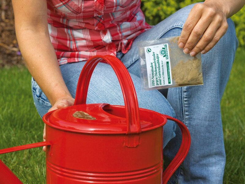 Über ein Bestell-Set Nützlinge gegen Bodenschädlinge*, das Sie im stationären Fachhandel oder Online kaufen, bestellen Sie die Fadenwürmer per Post direkt zu sich nach Hause. Die Nematoden werden zusammen mit dem Trägerpräparat einfach mit der Gießkanne ausgebracht. Optimaler Einsatzzeitpunkt ist Mitte April/Mai und August/September. Bei Befall sind zu diesen Zeiten Larven im Boden vorhanden. Bei Kübelpflanzen, deren Wurzelballen sich schneller erwärmt, können die Larven schon früher auftreten. Wiederholen Sie die Behandlung unbedingt im Folgejahr. Wichtig ist, jeweils im Frühjahr und im Herbst, zwei Jahre in Folge, die HM-Nematoden einzusetzen. Denn so lange können die erwachsenen Käfer leben und immer wieder neue Larven hervorbringen.