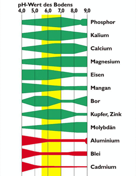 Zusätzlich hängt die Aufnahme der lebensnotwendigen Nährstoffe vom Säuregrad (pH-Wert) des Bodens ab. Wenn der Boden zu sauer ist, können Pflanzenwurzeln die Nährstoffe nur schlecht oder gar nicht aufnehmen.