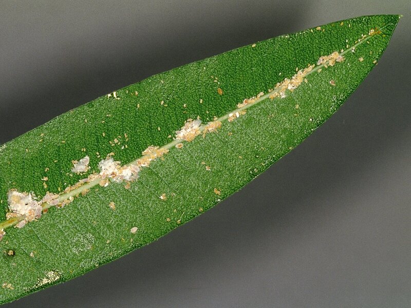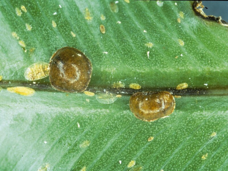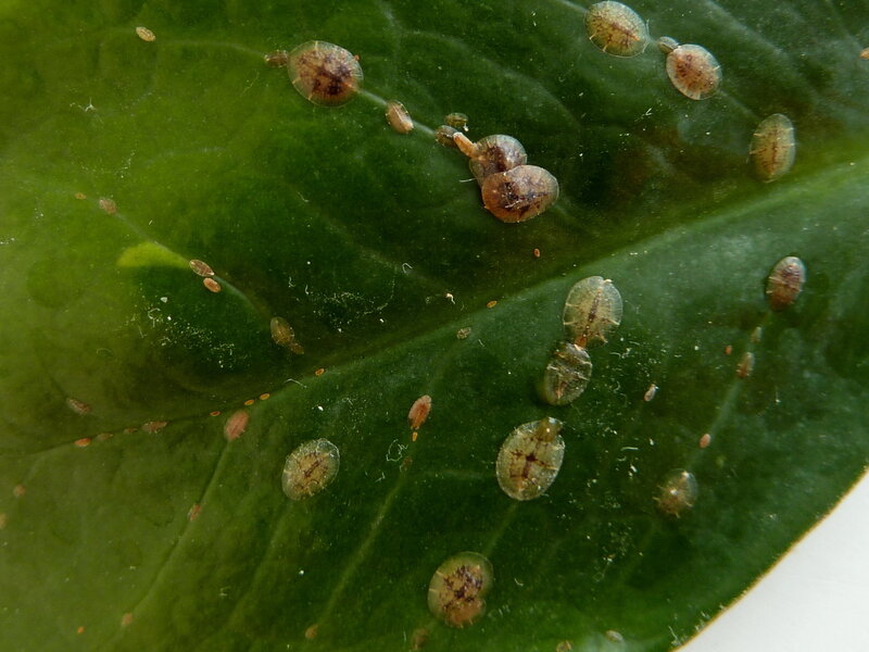 Schildläuse sehen schildartig aus, wie der Name schon vermuten lässt. Die ca. 1 – 3 mm großen, ovalen bis rundlichen Schildchen kleben auf und unter den Blättern, an Trieben und Blattstielen. Die meisten Schildläuse saugen ebenfalls den zuckerhaltigen Pflanzensaft. Durch die Ausscheidungen der Schildläuse werden die Pflanzen klebrig. Auch hier kann es zu einer Besiedlung mit Rußtaupilzen kommen, die die Blätter überziehen.