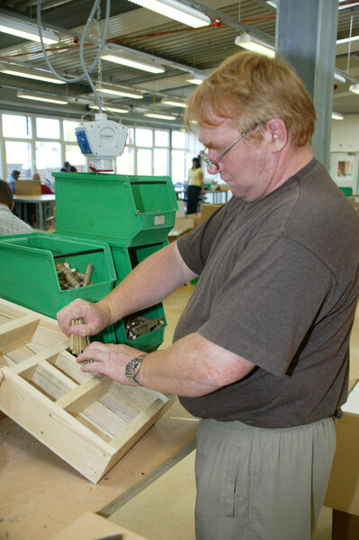 Auf die fertig zusammen gebauten Insektenhotels wird das Logo von Neudorff eingebrannt. Schließlich packen die Beschäftigten die fertigen Insektenhotels in die Verpackungen, stapeln sie auf Paletten – und freuen sich darüber, ein von ihnen selbst gefertigtes Produkt liefern zu können, mit dem sie Geld verdienen und das auch noch dem Umweltschutz dient.