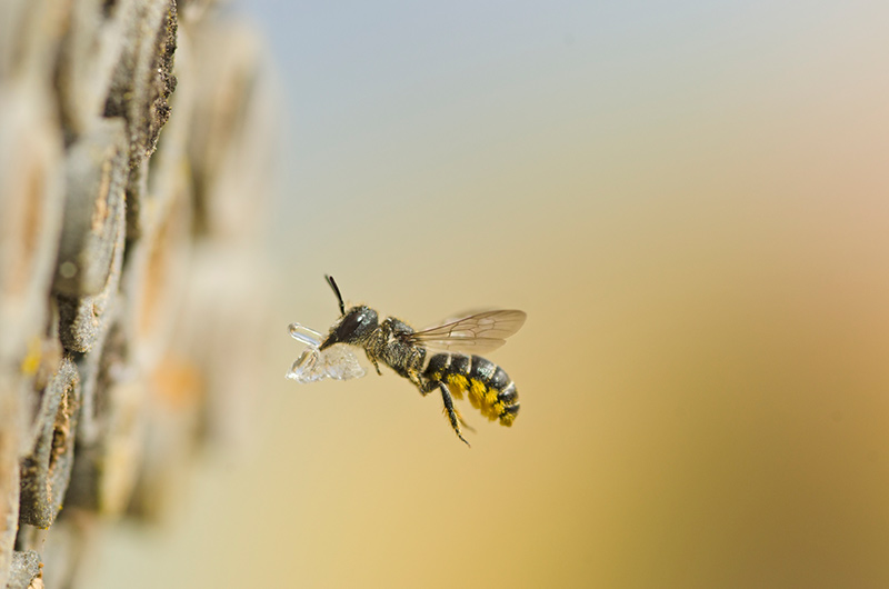 In den Röhren legen die Wildbienen einzeln ihre Eier ab, zusammen mit einem Nahrungsvorrat aus Pollen. Daraus schlüpft später die nächste Wildbienen-Generation. Die ersten Arten sind schon im März unterwegs und besuchen Krokusse und andere Frühblüher. Sehr gut lässt sich am Bienenhaus beobachten, wie die Wildbienen Pollen hineintragen, und die Öffnungen mit Lehm oder anderen Materialien wieder verschließen.