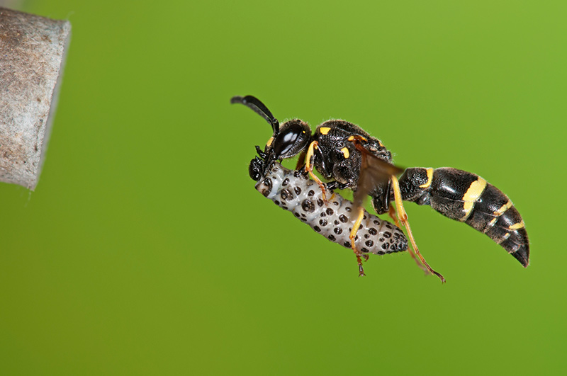 Ein bis zwei Wochen nach der Eiablage schlüpfen die Larven aus den Eiern und ernähren sich zwei bis drei Wochen lang von dem Nahrungsvorrat in ihrer Zelle. In dieser Zeit häuten sie sich mehrfach. Danach spinnen sie sich selbst einen Kokon, in dem sie sich zur Puppe entwickeln. Im Spätsommer schlüpfen dann die erwachsenen Tiere, die bis zum folgenden März im Insektenhotel überwintern.