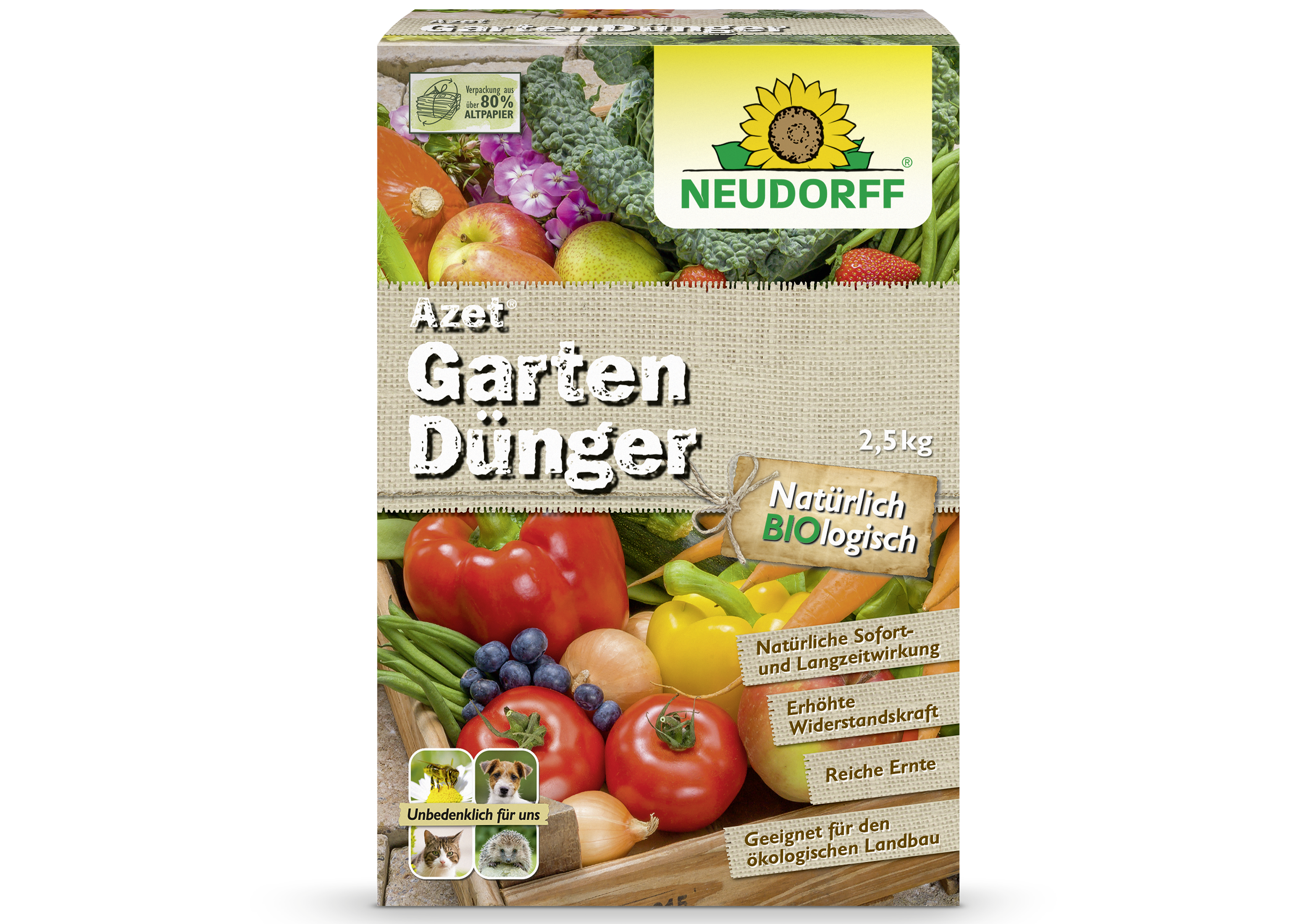 pro m2 75-150 g (je nach Pflanzenart) Azet GartenDünger ausstreuen und mit einer Harke 5-10 cm tief in den Boden einarbeiten
