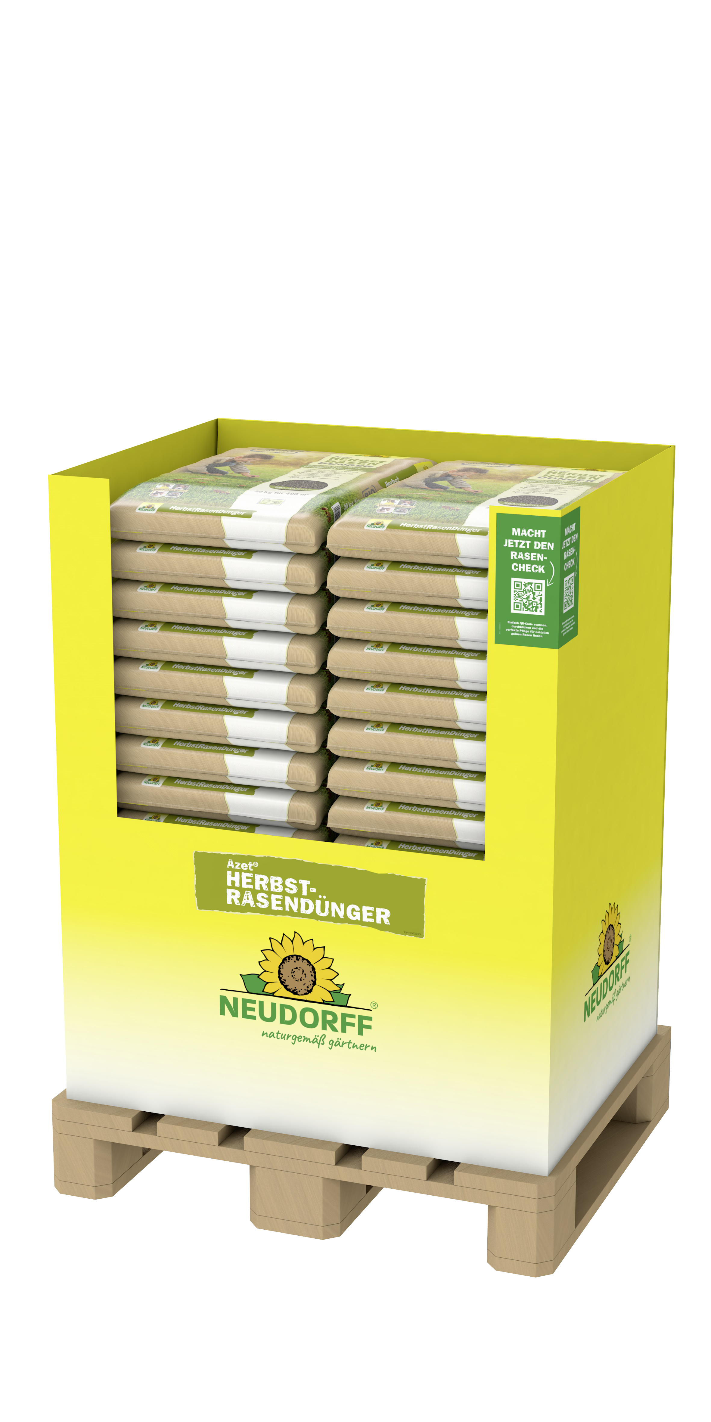 bringen Sie 50 g/m² Azet HerbstRasenDünger im Zeitraum von Ende August bis Oktober gleichmäßig mit der Hand oder dem Streuwagen aus