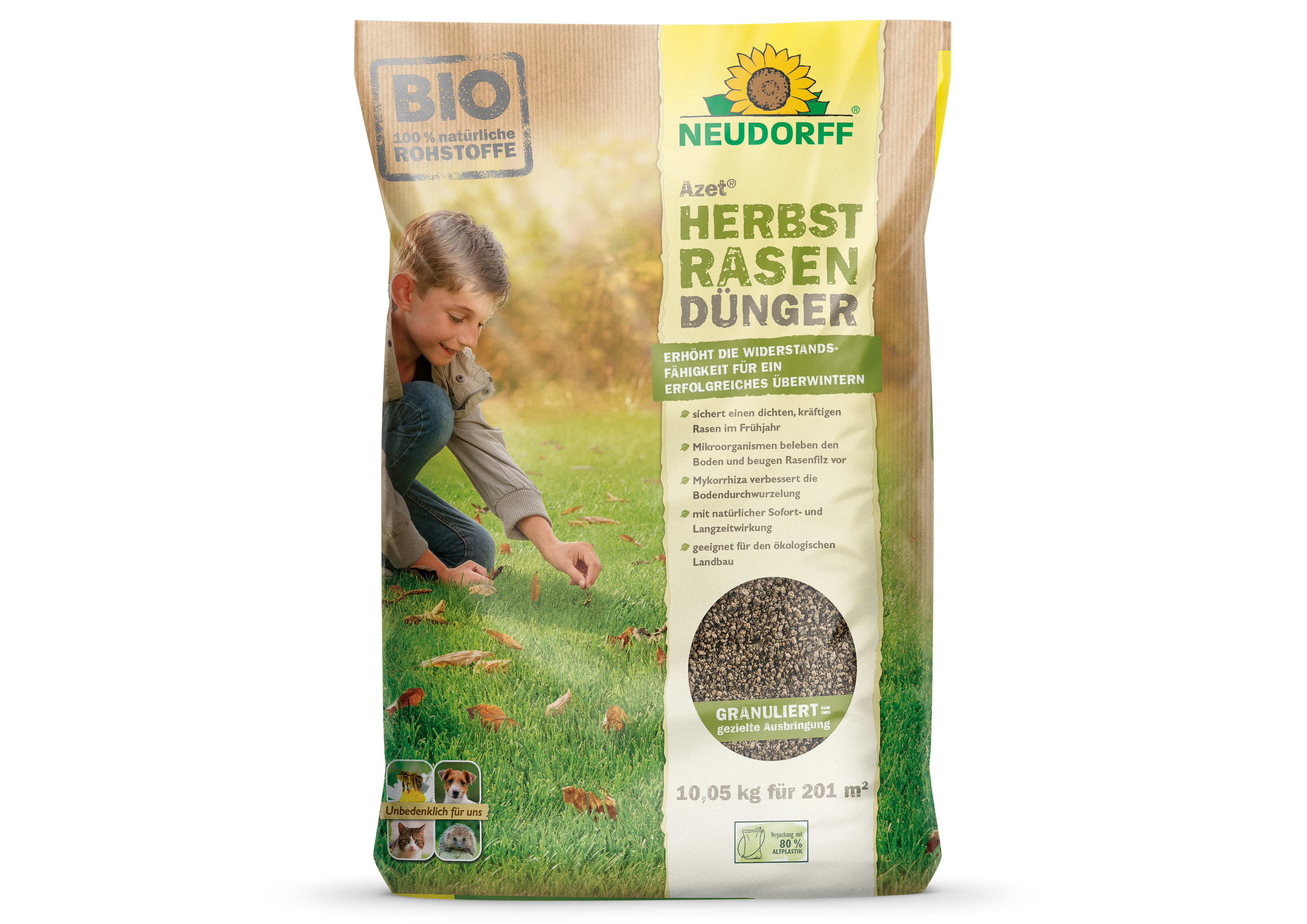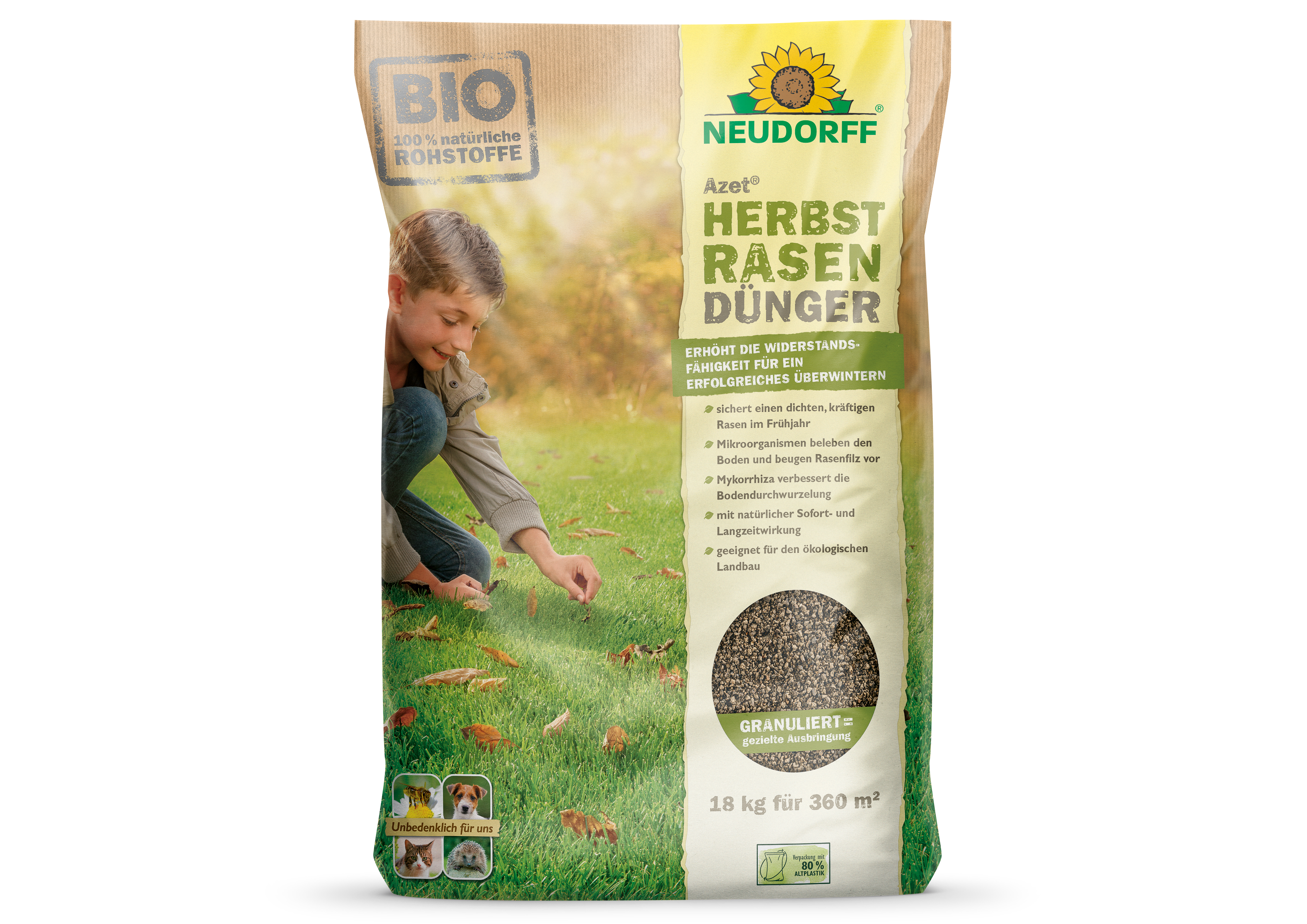 Sie möchten, dass Ihr Rasen auch im Winter schön grün bleibt? Dann stärken Sie ihn im Herbst durch eine Düngergabe. Mit organischem Dünger versorgte Rasengräser sind widerstandsfähiger, überstehen die kalte Jahreszeit besser und sind im Frühjahr schnell wieder grün.