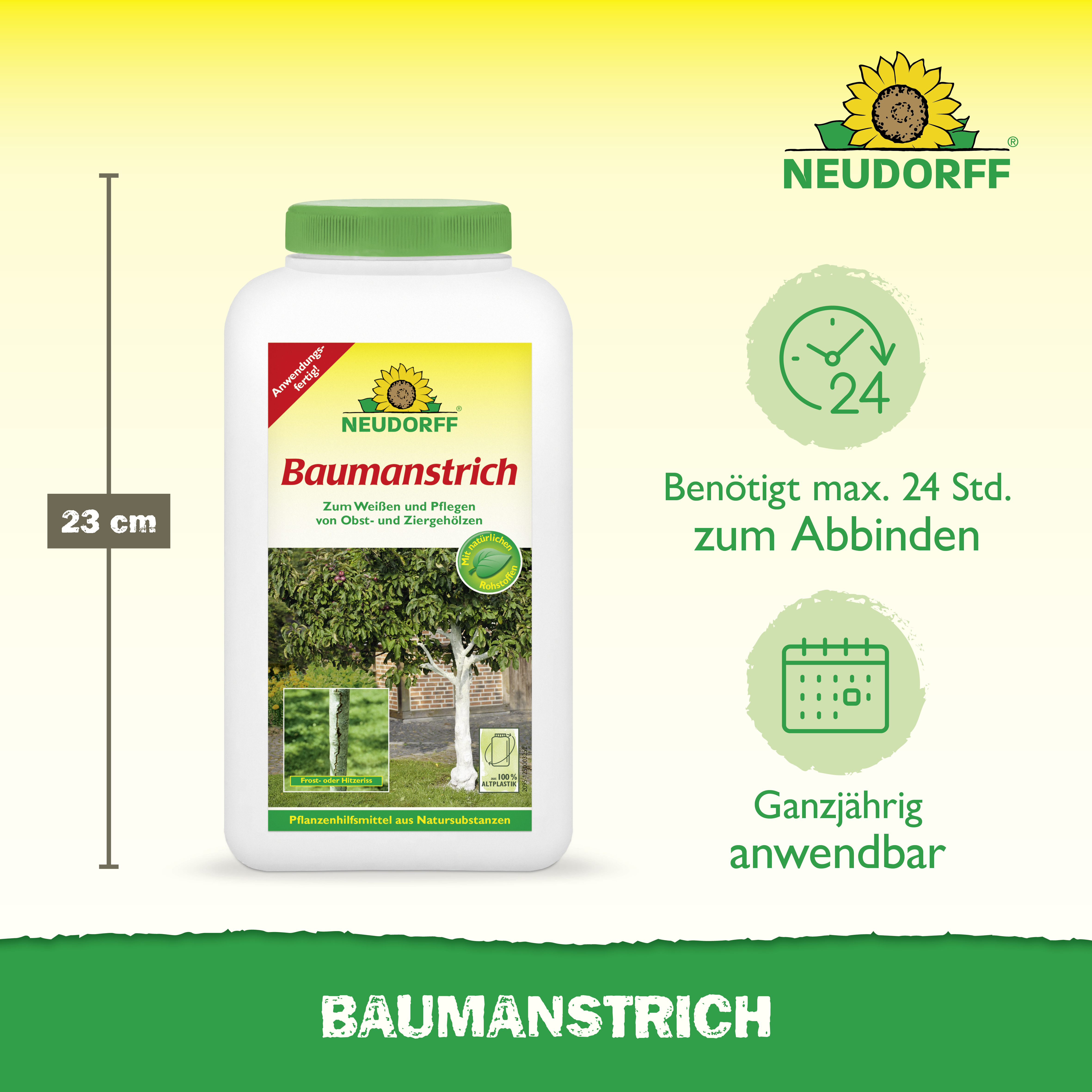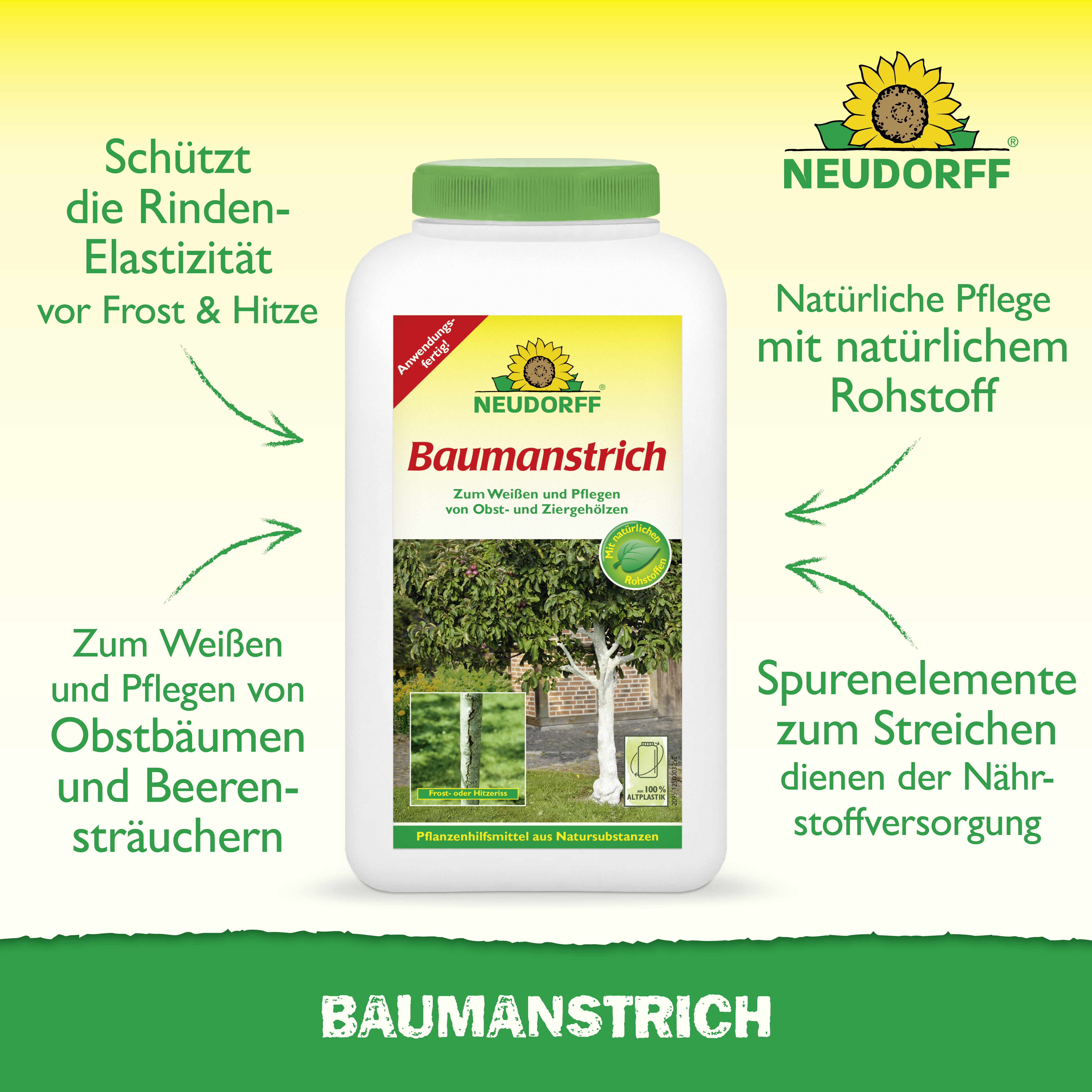 Bei Frösten im Winter und Hitze im Sommer können durch starke Temperaturschwankungen Risse in der Rinde entstehen. Dadurch wird das Gehölz gefährdet. Schützen und pflegen Sie die Baumrinde nachhaltig mit diesem Anstrich.