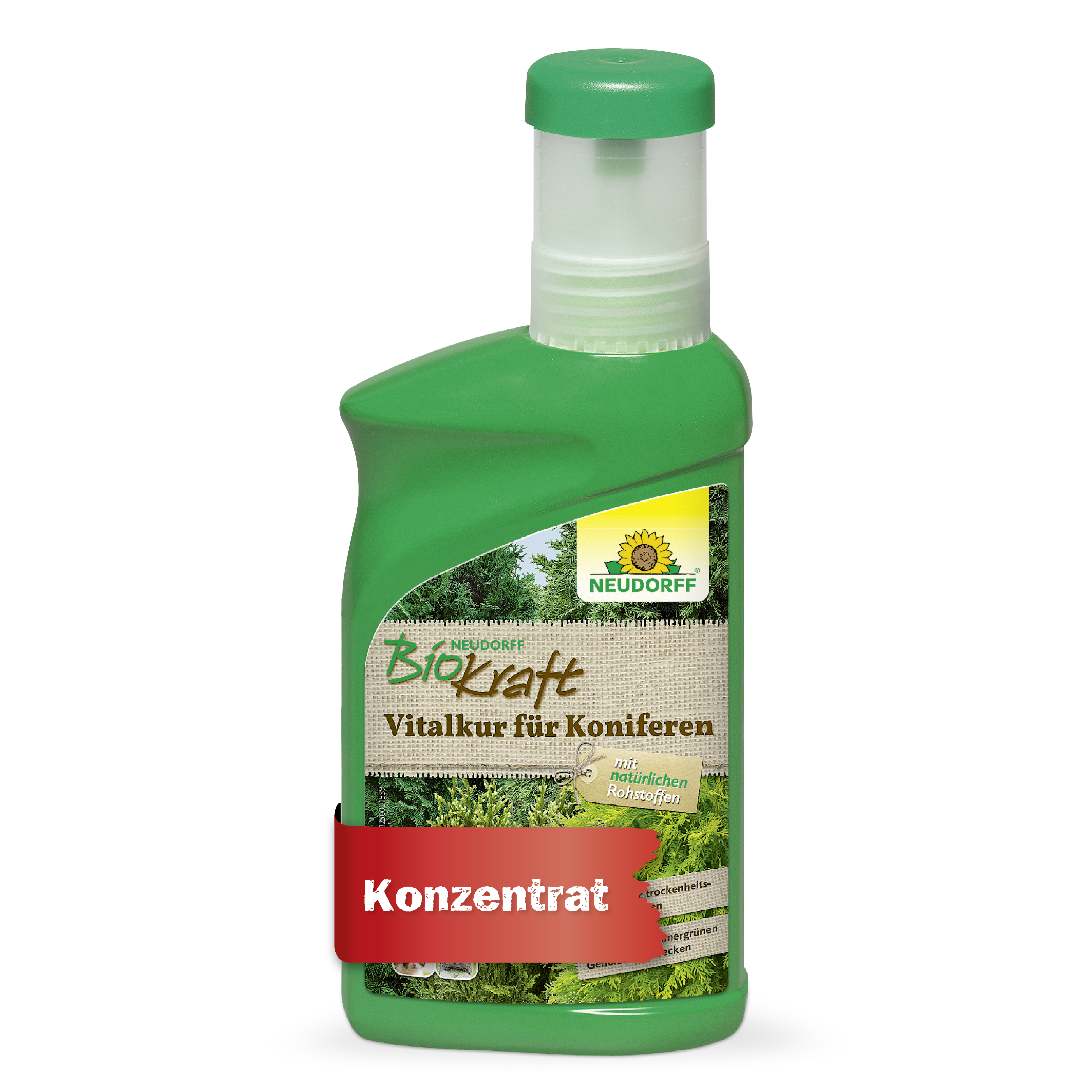 Neudorff BioKraft Vitalkur für Koniferen & Immergrüne mehrmals 0,3-1 %ig, je nach Zustand der Pflanzen, d.h.15-50 ml auf 5 Liter Wasser, spritzen. Kann ganzjährig gespritzt oder auch gegossen werden.