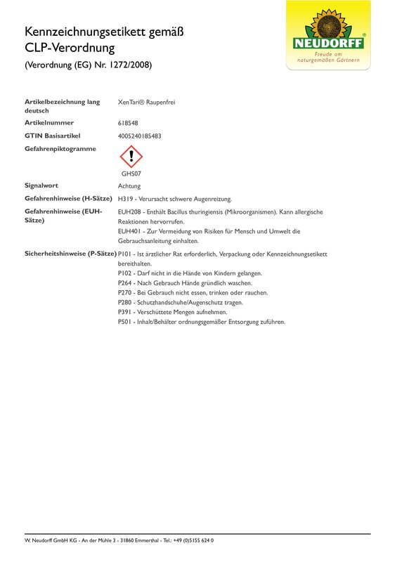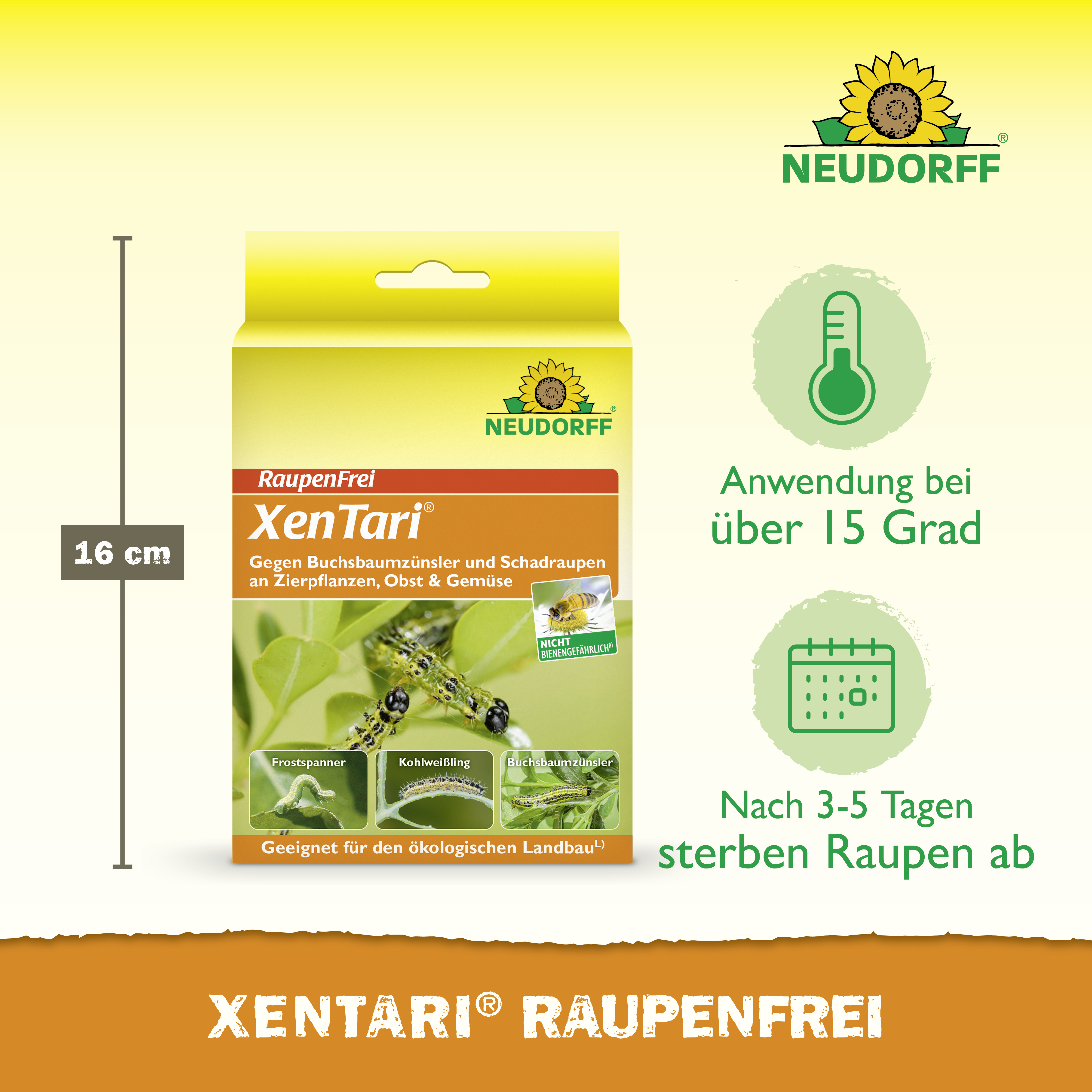 - Wirkt ganz gezielt gegen verschiedene Schmetterlingsraupen wie z.B. Buchsbaumzünsler, Frostspanner und Kohlweißlinge.