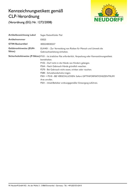 200 g (entspricht 20 Beutel) pro Köderstelle. Vor dem Gebrauch alle Produktinformationen sowie alle Informationen, die während des Kaufs übermittelt werden, lesen und befolgen. Für Folgen unsachgemäßer Anwendung haften wir nicht. Rattenköder müssen in gesicherten Köderstationen ausgelegt werden. Das Auslegen von Ködern außerhalb von Köderstationen stellt eine hohe Vergiftungsgefahr für Menschen, Haus- und Wildtiere dar! Um ein Verschleppen der Köder zu verhindern, diesen gut in der Köderbox fixieren, damit die Ratte den Köder vernünftig aufnimmt. Wenn mehr als eine Köderstation benötigt wird, sollte der Mindestabstand zwischen den Köderstationen 5 - 20 m betragen. Papierbeutel um die einzelnen Portionen nicht öffnen oder entfernen.