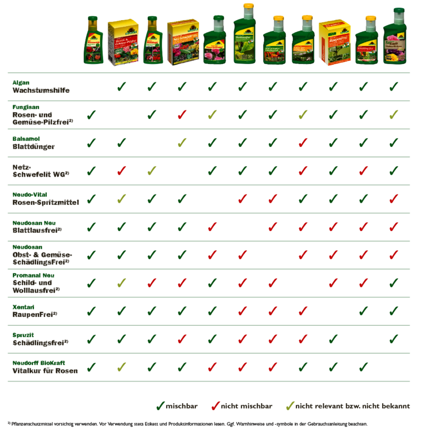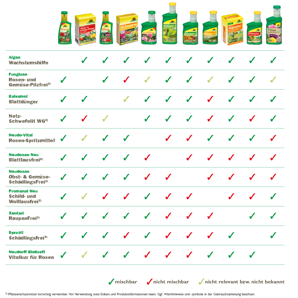 Treten unterschiedliche Schaderreger gleichzeitig auf ist es sinnvoll, die entsprechenden Produkte nach Möglichkeit gleichzeitig einzusetzen. Die Tabelle gibt Aufschluss darüber, welche Produkte miteinander gemischt werden können. Dort wo das Verhalten bei der Mischung nicht bekannt ist sollten die Präparate separat ausgebracht werden. So kommt es nicht zu Wirksamkeitsverlusten oder Pflanzenschäden.