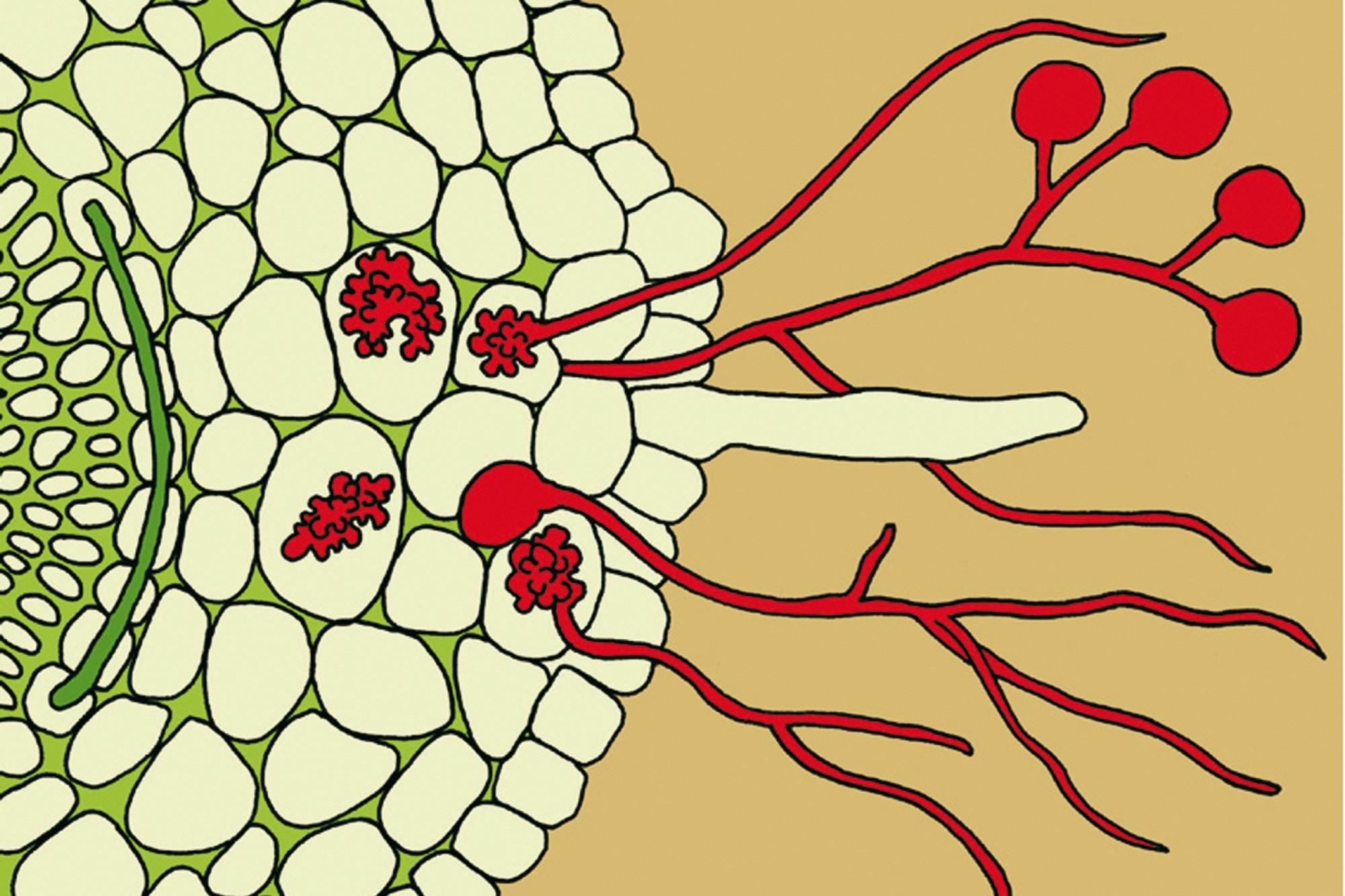 Besondere Wechselbeziehung bestimmter Pilzarten mit den Wurzeln spezieller Pflanzen. Der Pilz umwächst die Pflanzenwurzel. Für die eigene Entwicklung versorgt sich die Mykorrhiza aus der Pflanze mit Kohlenhydraten. Dafür vergrößert sie die Wurzeloberfläche der Pflanze. Diese hat dadurch bessere Möglichkeiten, aus dem Boden Wasser und Nährstoffe aufzunehmen. Außerdem entzieht die Pflanze der Mykorrhiza Phosphat und Spurenelemente.